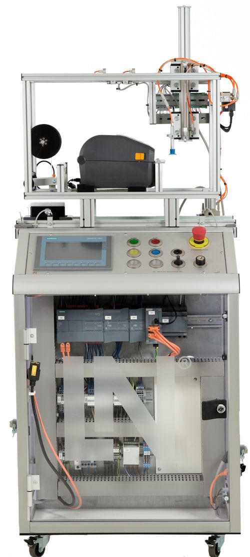 Auf der Mechatronic Unit befindet sich ein Werkstückträger mit einem montierten Block, bestehend aus Ober- und Unterteil. Der Träger fährt mit dem Produkt unter die Labeln-Station. Die Station enthält einen Label-Drucker, der über eine SPS gesteuert QR Codes auf Sticker druckt. Diese Sticker werden über einen Sauger auf dem Produkt angebracht. Zum Abschluss fährt der Träger an das Ende des Gurtbands, um dort von der nächsten Unit übernommen zu werden.