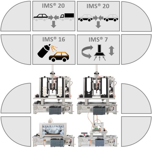 Die Anlage dient zum Erlernen aller erforderlichen Arbeitsschritte. Von der Konzeption, über den mechanischen Aufbau bis zur SPS-Programmierung einer vollautomatisierten Produktionsstraße. Der Weg führt von den Grundlagen eines einzelnen Subsystems bis zur fortgeschrittenen Programmierung und Vernetzung gesamter Anlagen. Ein mehrteiliges Auto mit integrierter Funktionsplatine, Fahrgestell und unterschiedlichen Karosserien wird in einer vollautomatisierten Produktionsstraße komplett montiert und 'lackiert'.
