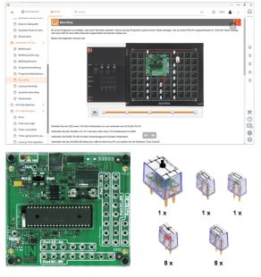 Mikrocontroller-Adapter mit Sockel, integriertem Programmer über USB-Schnittstelle, ausgeführten Messpunkten, und Ports