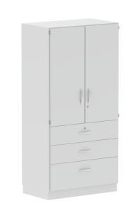 SybaPro Kombinations-Laborschrank, mit 2 Türen im oberen Bereich sowie 3 Schubladen im unteren Drittel. Dieser Schrank dient zur Aufbewahrung von größeren Geräten und Systemen im oberen Türbereich sowie von Messgeräten, Kleinteilen und Ähnl. im unteren Schubladenbereich. Dieser Laborschrank ist nach den Sicherheitsanforderungen gemäß DIN EN 16121 geprüft.